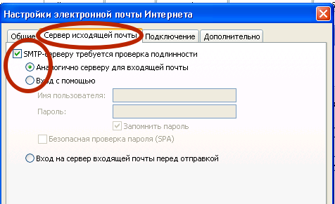 4) На вкладке «Сервер исходящей почты» ставим галочку «Требуется проверка подлинности»: