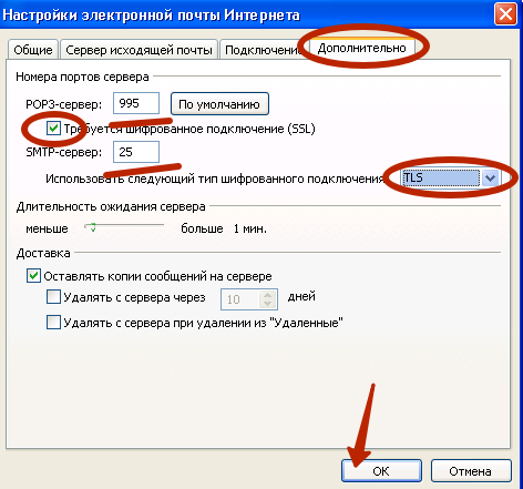 5) Для учётной записи POP3: на вкладке «Дополнительно» сначала выставляем галочку «Требуется шифрованное подключение» для POP3 и «Тип шифрованного подключения» «TLS» для SMTP, потом проверяем правильность портов:
