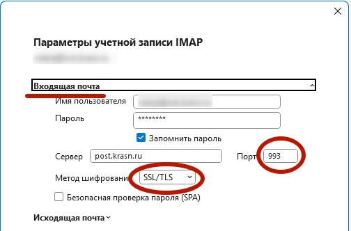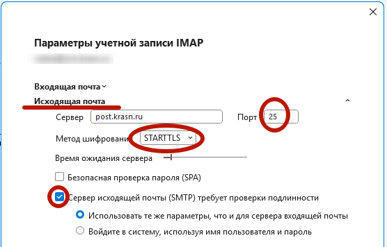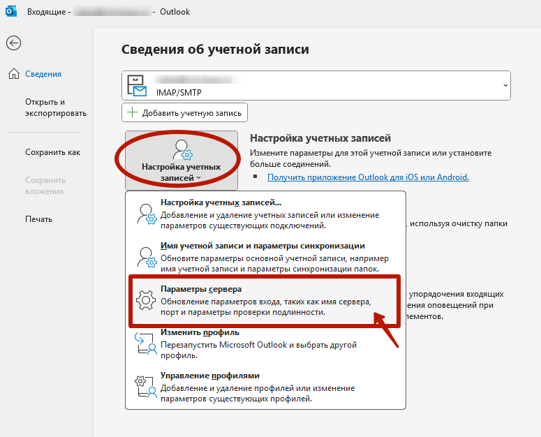 Настройка Microsoft Outlook 2016+ (новый) classic1) Открываем меню: ![]() 2) Выбираем «Настройка учётных записей», «Параметры сервера»: ![]() 3) В разделе «Входящая почта» выбираем метод шифрования и проверяем порт. Для учётной записи IMAPон должен быть равен 993, как показано на рисунке. Для учётной записи POP3 он должен быть равен 995. ![]() 4) В разделе «Исходящая почта» выбираем метод шифрования, проверяем порт, включаем галочку «Сервер требует проверки подлинности»: ![]() 5) Нажимаем «Далее», «Готово» и выходим из режима настройки: ![]() 6) Настройка окончена. Для проверки можно отправить письмо самому себе, чтобы убедиться, что и отправка, и получение работают. |