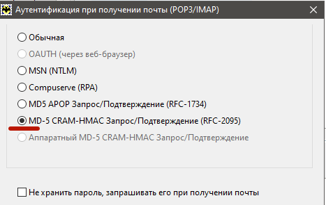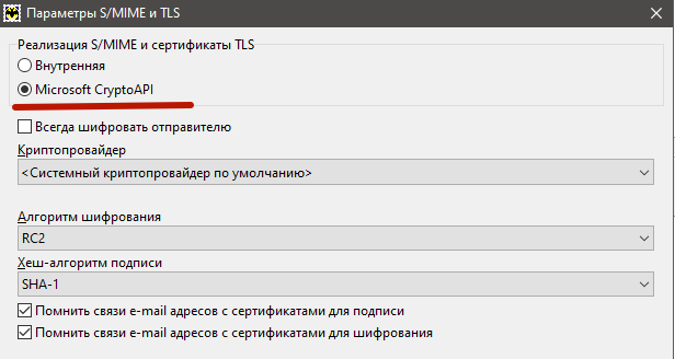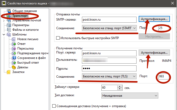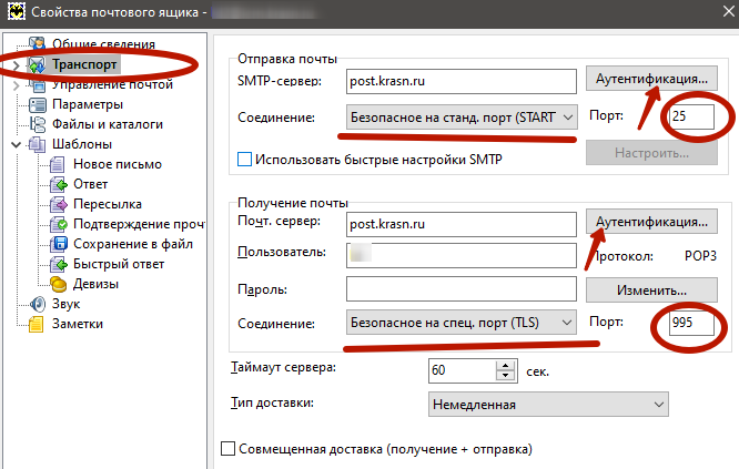 2) Выбираем пункт «Транспорт». В разделе «Отправка почты» выбираем тип соединения «Безопасное на станд. порт (STARTTLS), потом проверяем порт. В разделе «Получение почты» выбираем тип соединения «Безопасное на спец. порт (TLS)», проверяем порт. В зависимости от типа учётной записи это будет либо порт 993 (для IMAP, как на скриншоте ниже), либо 995 (для POP3, см. следующий пункт): ![]() 3) То же окно настроек для учётной записи типа «POP3»: ![]() 4) На этом же окне нажимаем кнопки Аутентификация. Для верхней кнопки (Отправка почты, SMTP): ![]() Для нижней кнопки (Отправка почты, POP3/IMAP): ![]() 5) Нажимаем «OK». 6) Для проверки можно отправить письмо самому себе, чтобы убедиться, что и отправка, и получение работают. 7) Если при попытке отправить письмо возникает сообщение «Сервер не предоставил корневой сертификат, соединение не может быть секретным», значит, список корневых сертификатов программы устарел и необходимо перейти на использование системного хранилища. Для этого нажимаем «Отмена», открываем меню «Свойства / S/MIME и TLS...»: ![]() И там выбираем MicrosoftcryptoAPI: ![]() 8) Настройка окончена. |